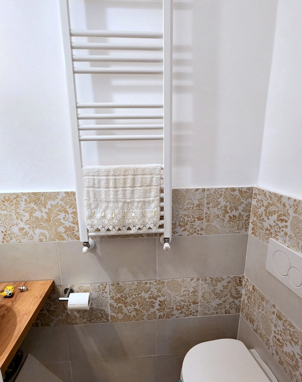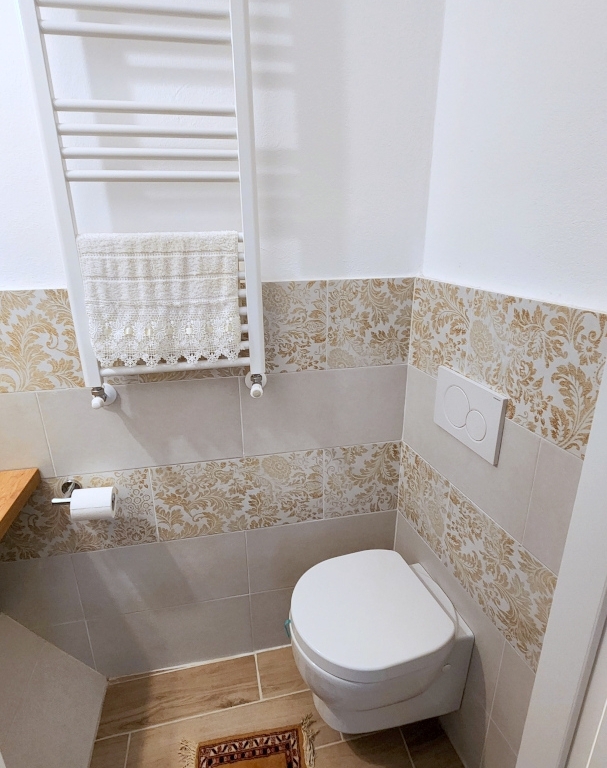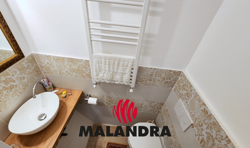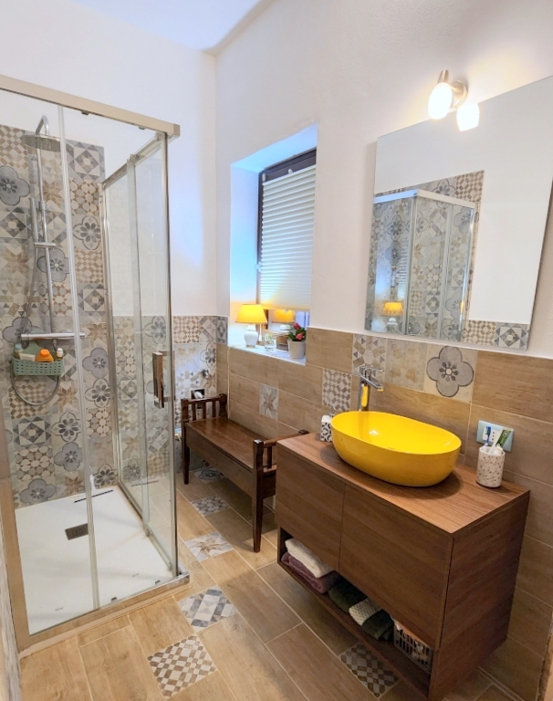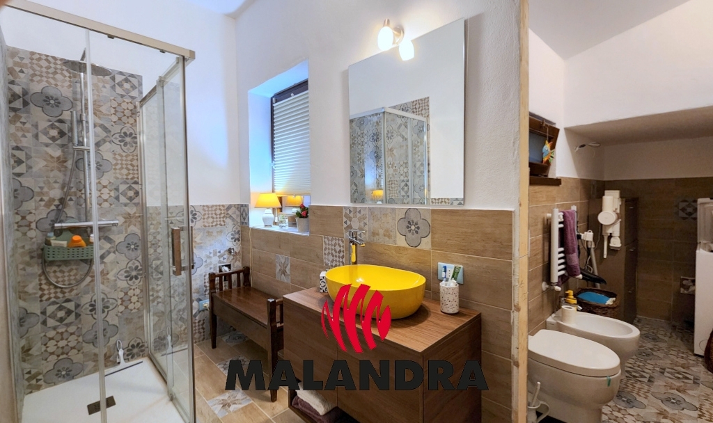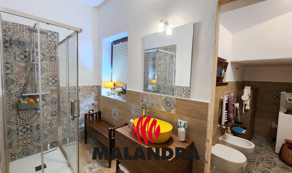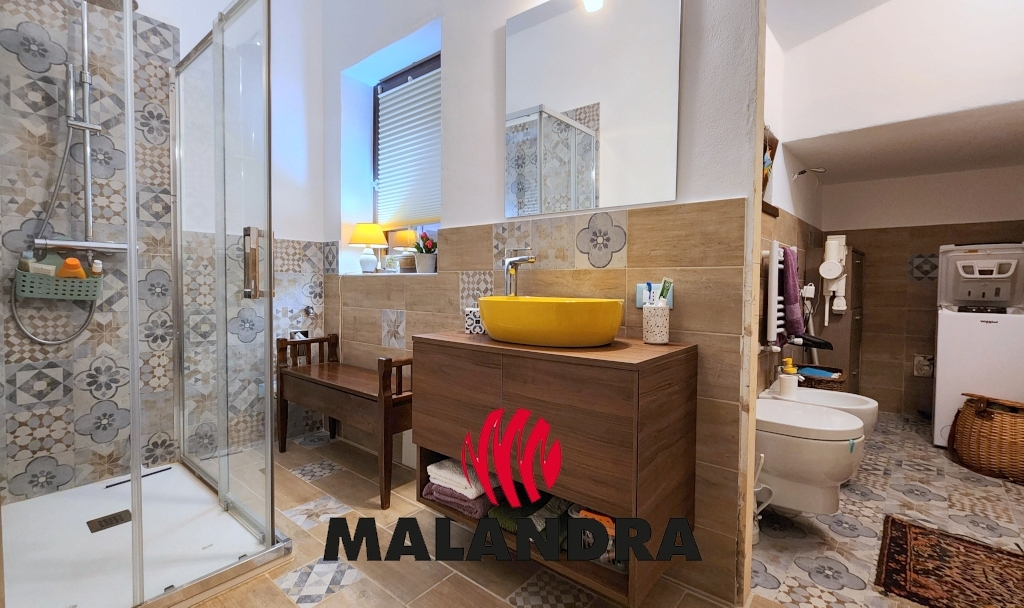 Il piano primo ospita la camera da letto, un secondo bagno di servizio, molto piccolo con lavabo e wc e un ampio terrazzo di circa 25 mq.