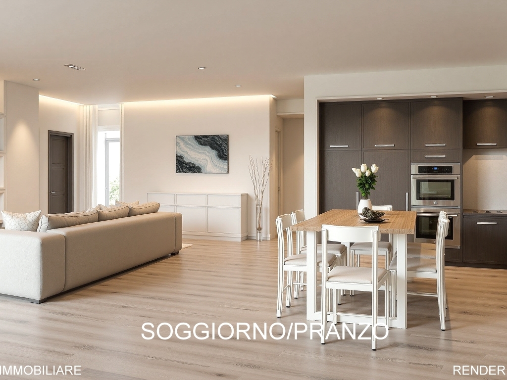 Al piano terra si trovano: Ampio soggiorno/pranzo di circa 47 m² con uscita sul portico coperto e sul giardino, Disimpegno, bagno finestrato, ripostiglio, Accesso diretto al box doppio